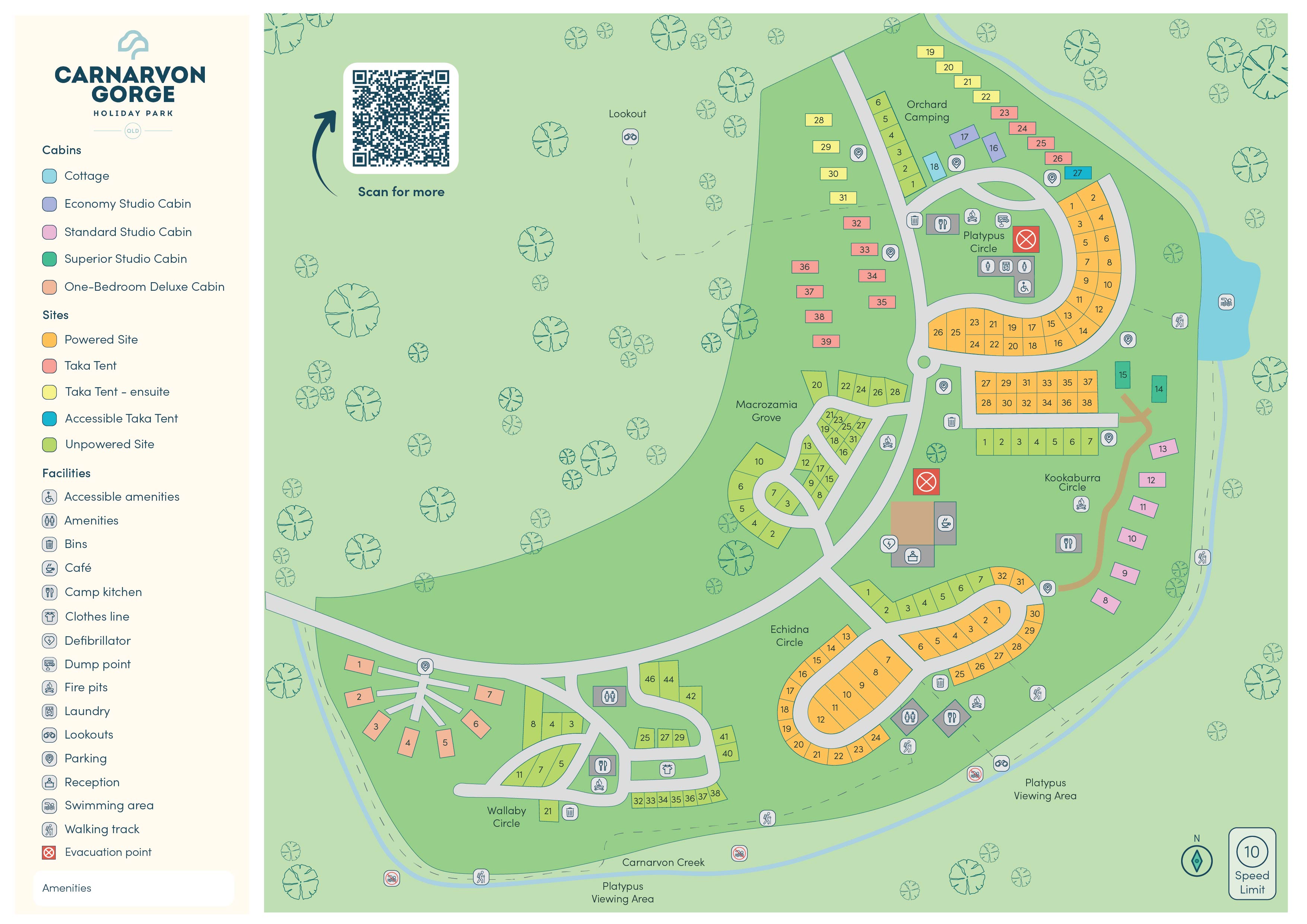 Explore BIG4 Carnarvon Gorge Holiday Park’s layout with our detailed park map, highlighting accommodation options, amenities, and recreational areas to help you plan your stay.